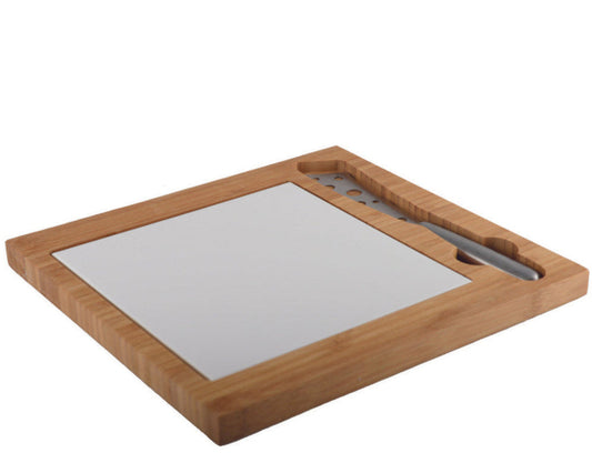 KAASPLANK VAN BAMBOE EN PORSELEIN MET ROESTVRIJ STALEN MES