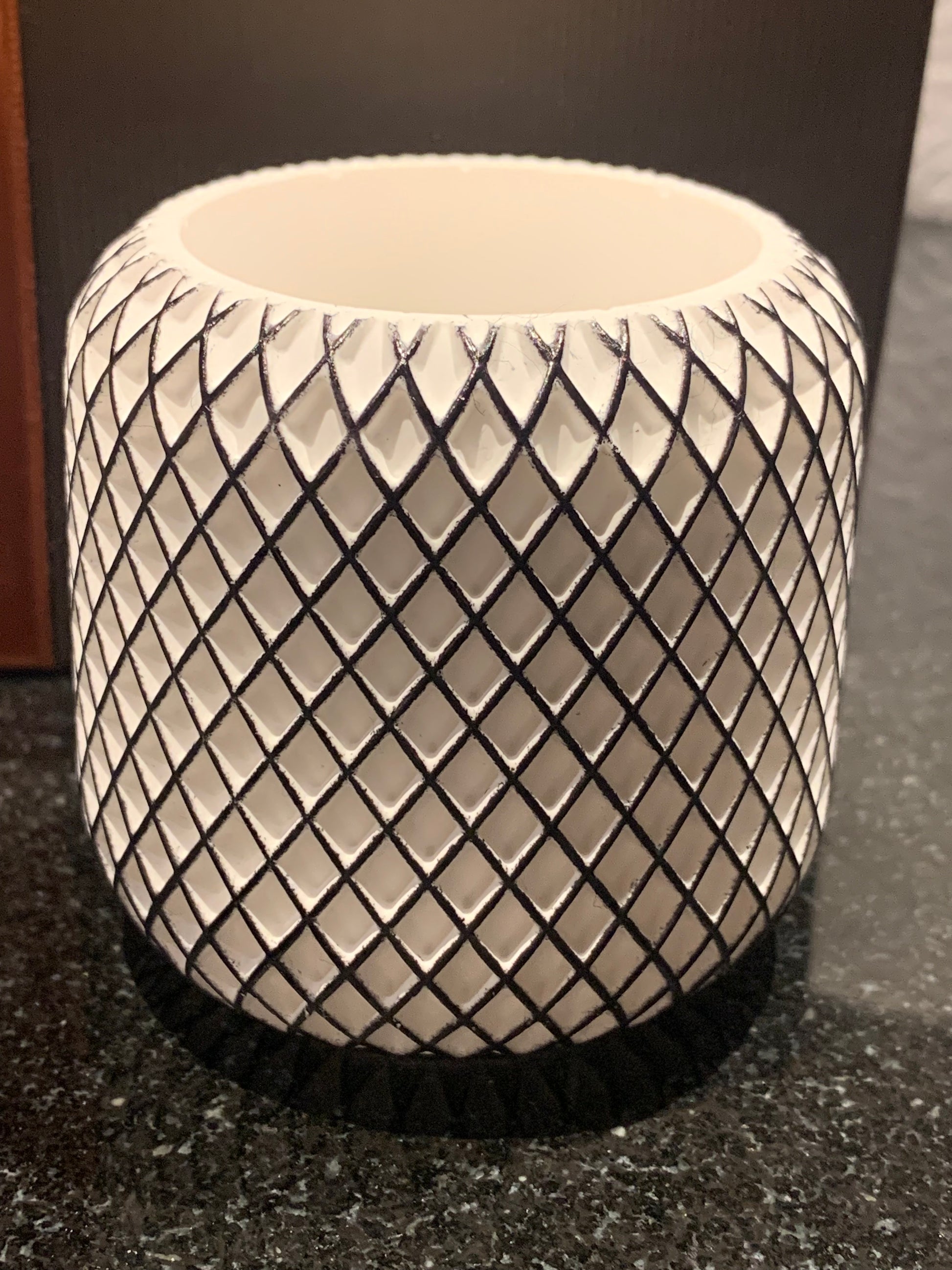 Met de hand gemaakt uit porselein en afgewerkt met een speels ruitenpatroon.