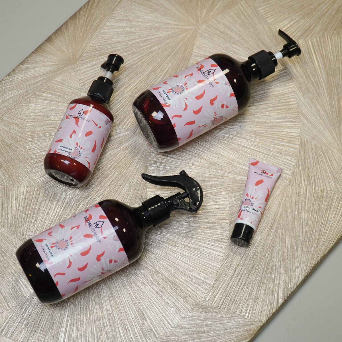 De handzeep zit in een bruin plastic flesje met een zwart pompje, voorzien van speelse prints en heerlijke geuren. In dezelfde collectie vind je ook bijpassende kamersprays en rietverspreiders, zodat ook je interieur kan meegenieten.