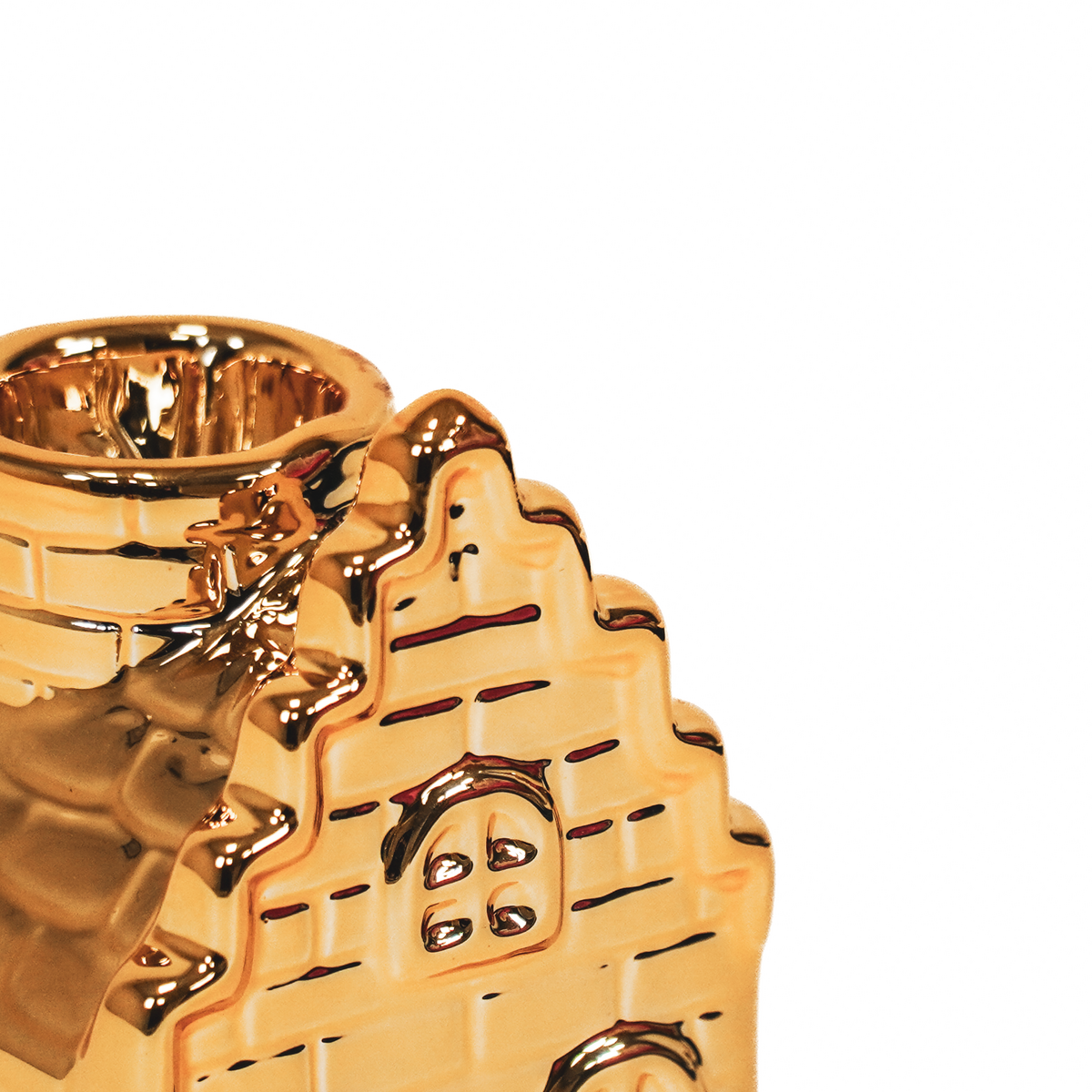 HUIS + KAARS = EEN THUIS! Licht en warmte maken van een huis een écht thuis. Deze gouden huis-kandelaar van Housevitamin brengt beide samen en geeft je interieur een sfeervolle, luxe uitstraling. Het ontwerp is geïnspireerd op de karakteristieke Amsterdamse grachtenpanden – zo haal je een vleugje stadsgevoel in huis.