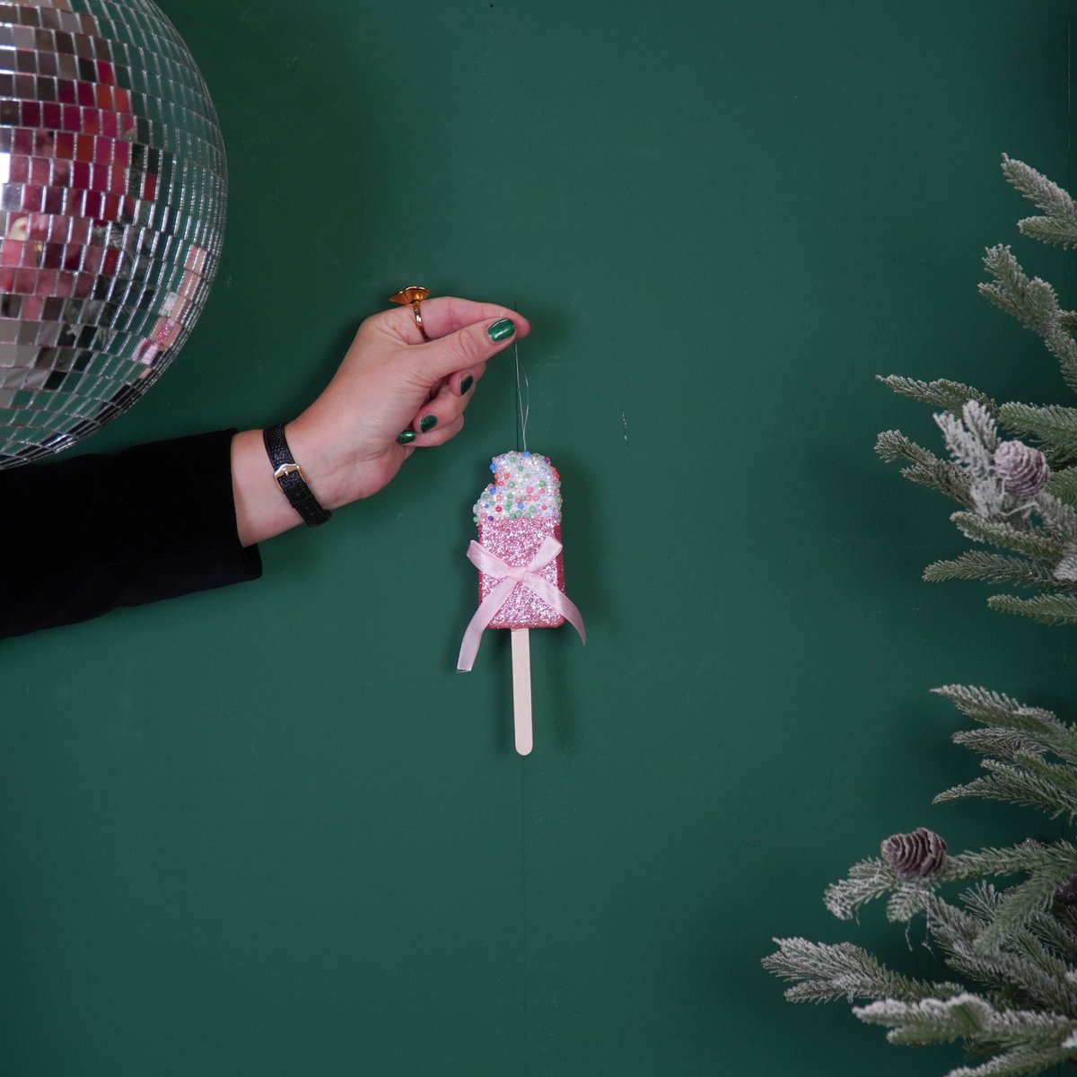 Met zijn roze glans, discobol-hagelslag en glittertopping is dit ornament onweerstaanbaar vrolijk. Het houten stokje en de glanzende afwerking maken hem helemaal af – alsof hij zó uit een snoepwinkel komt. En wanneer de kerstlichtjes erop schijnen? Pure magie.