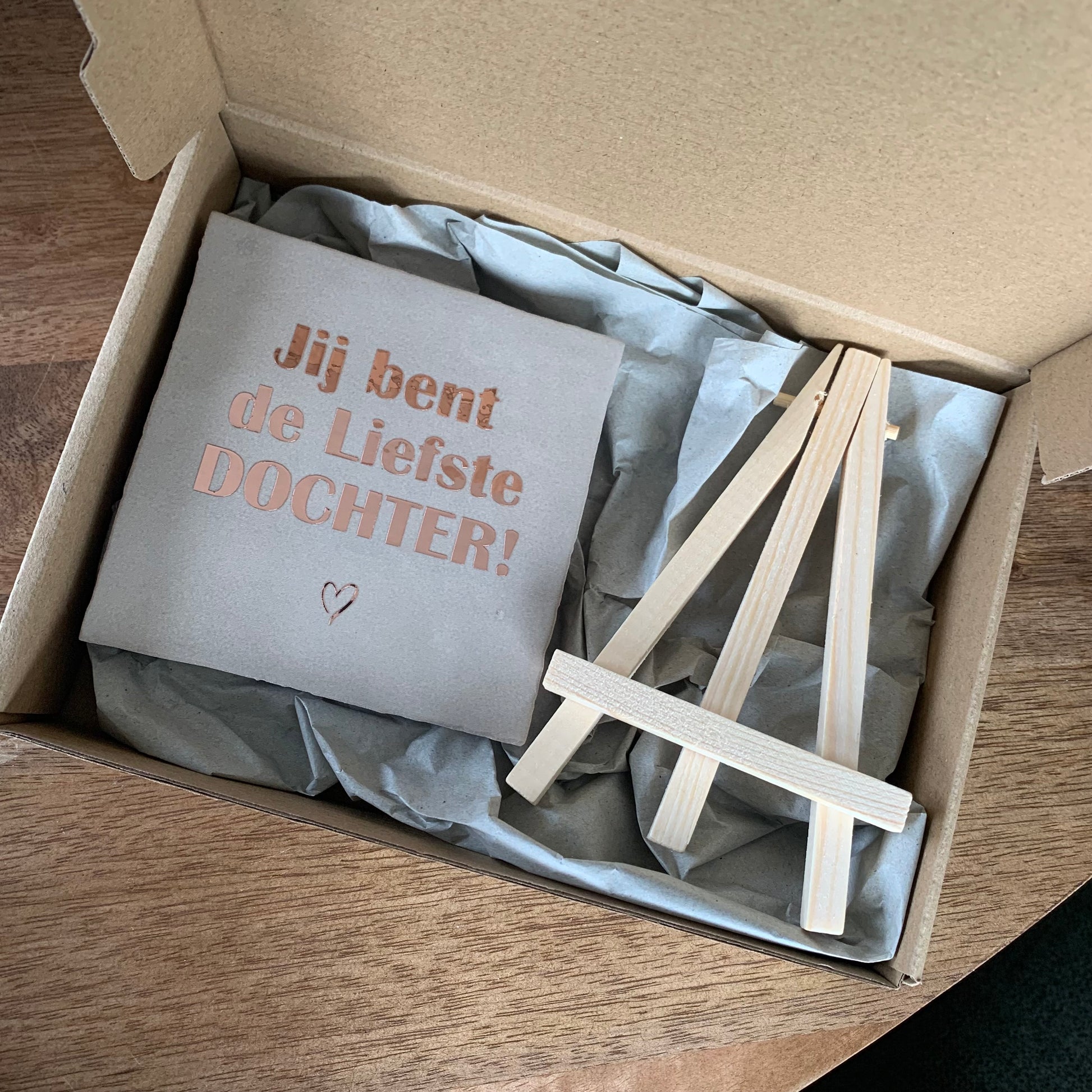 Een tegeltje van 10 x 10 cm, mét staandertje en verpakt in een mooi kraft doosje – helemaal klaar om cadeau te doen (of zelf te houden natuurlijk 😉).